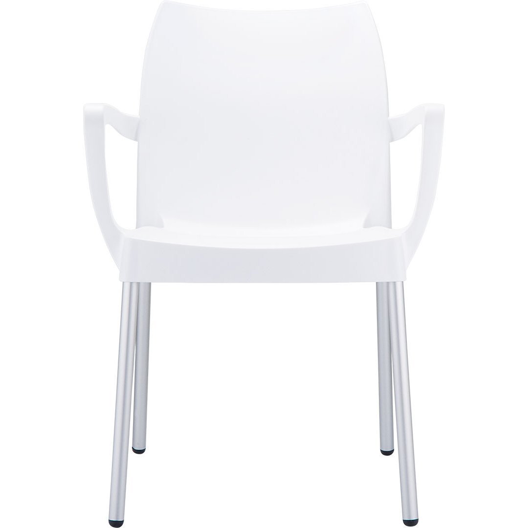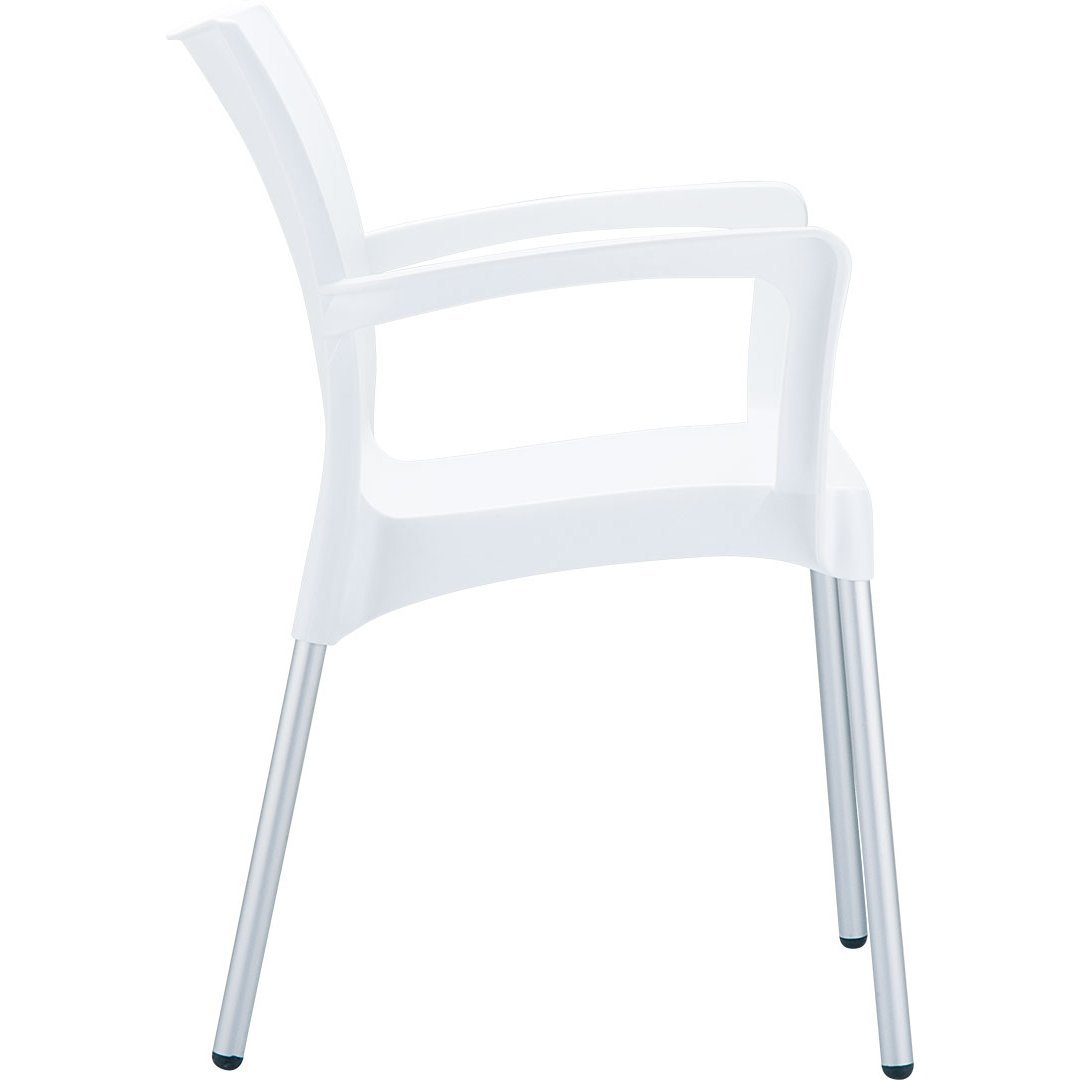 Stohovateľná stolička s recyklovateľným polypropylénovým sedadlom a podrúčkami, s nohami z eloxovaného hliníka. Priemer nohy stoličky je 25 mm. Pre vnútorné aj vonkajšie použitie.