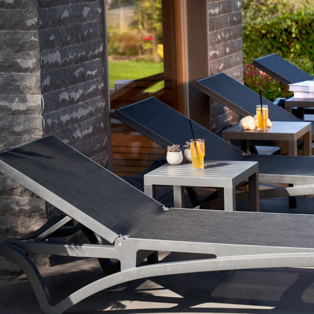 Pohodlné lehátko s odolnou tkaninou je vyrobené z poveternostne odolnej živice chránenej proti UV žiareniu vystuženej skleneným vláknom, ktoré odolá letným prehánkam a silnému slnku, vďaka čomu je ideálnym bezstarostným doplnkom vonkajšieho posedenia. Lehátka sú stohovateľné.