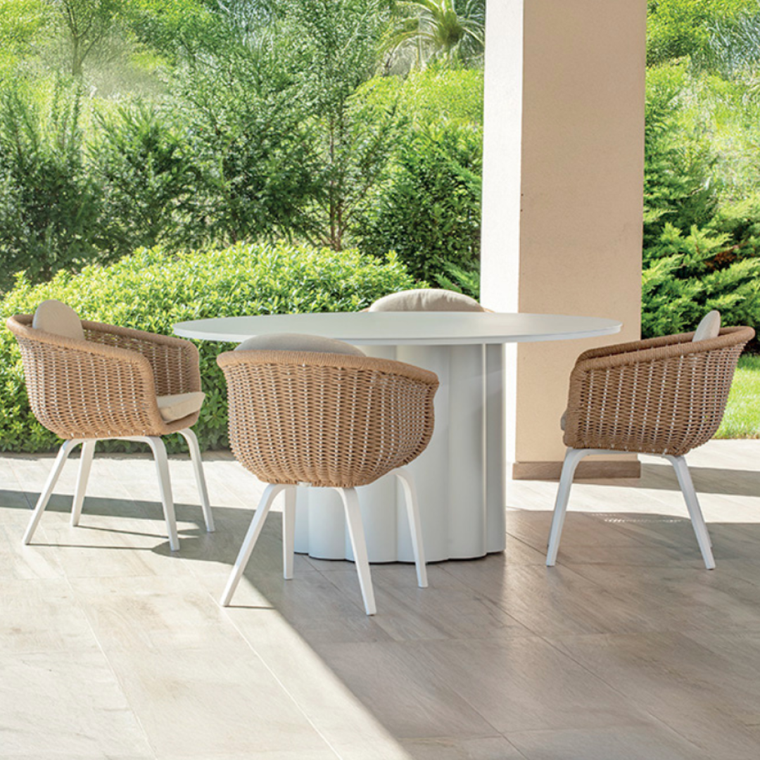 BARBUDA je jedálenský stôl s čistým a výrazným dizajnom, ideálny na vybavenie vonkajších priestorov. Celá konštrukcia je vyrobená zo zváraného hliníka.