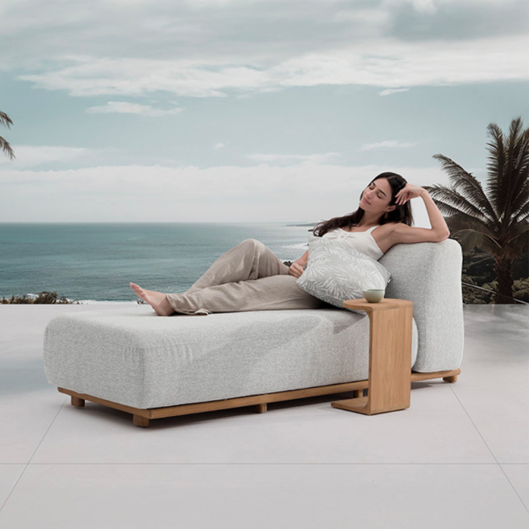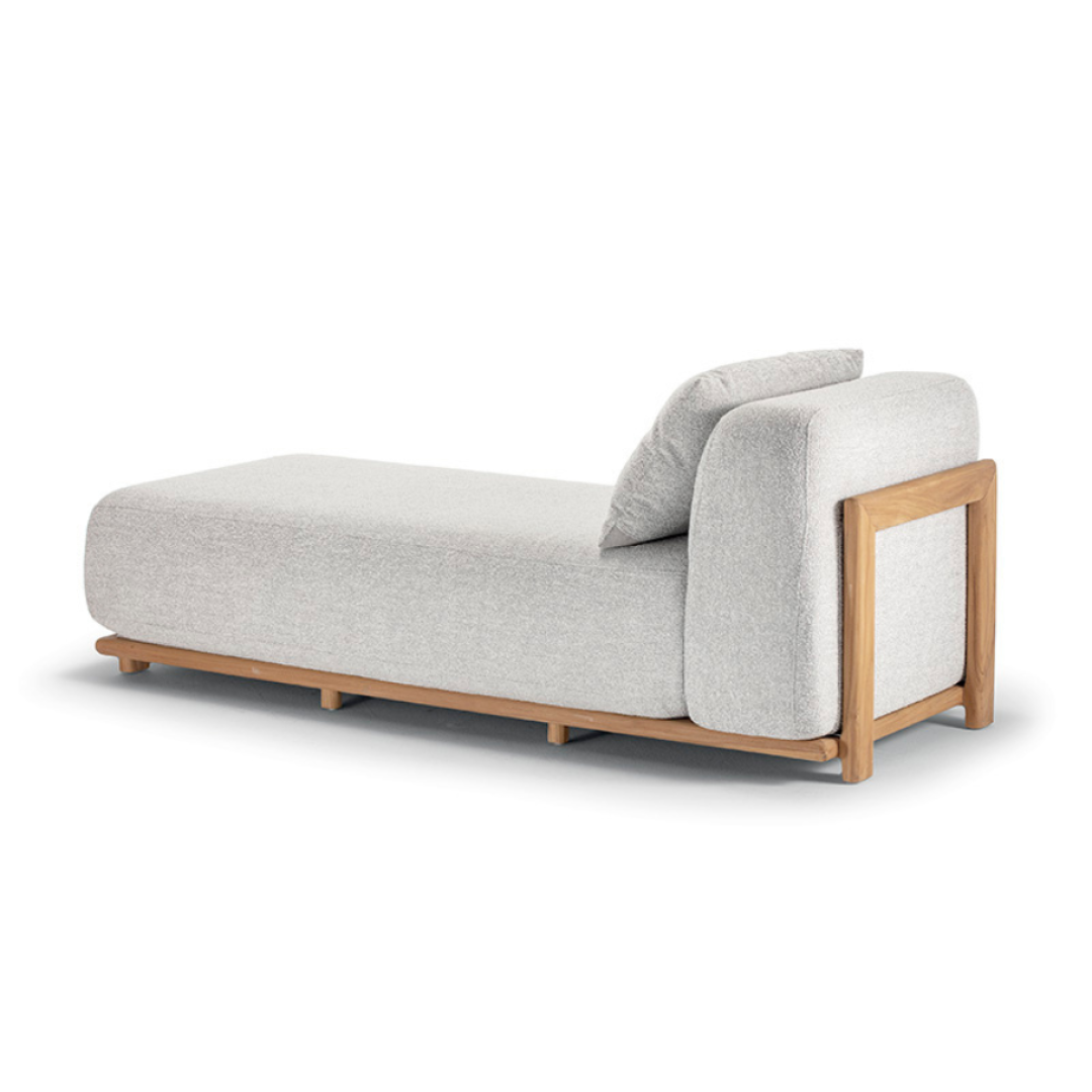 Pohodlné ležadlo s chrbtovou opierkou, s detailom z teakového dreva, ideálne do exteriéru.